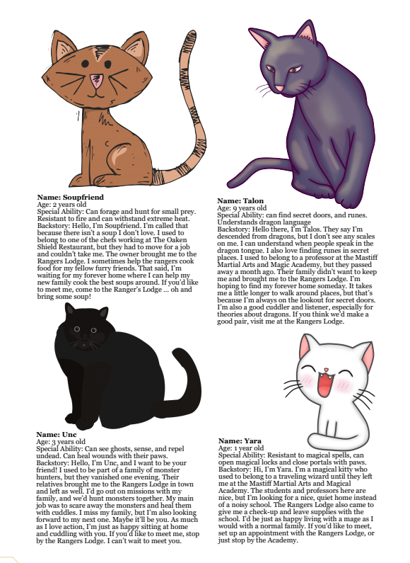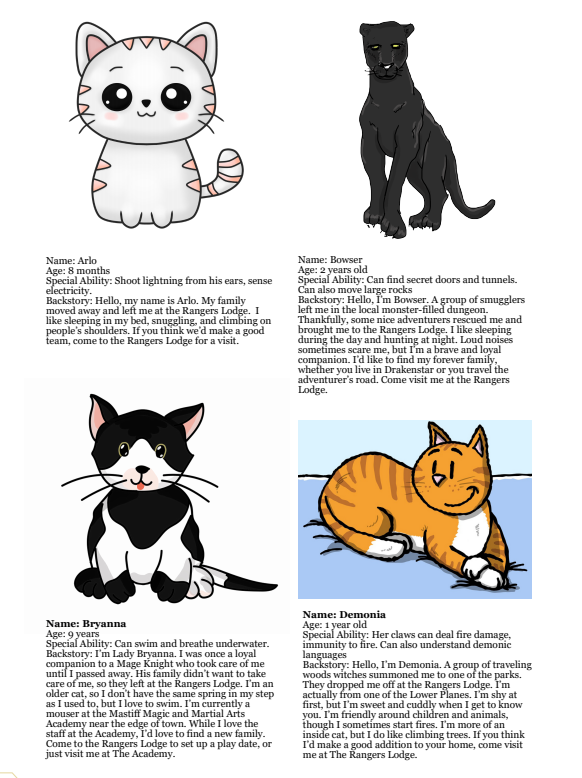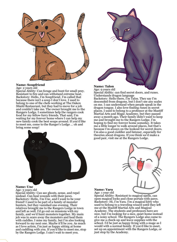 Ever wanted to bring a feline friend with you on your adventures? You're in luck as The Rangers Lodge has 20 cat NPCs up for adoption. Each cat has a name, age, one or more special abilities, and a backstory.